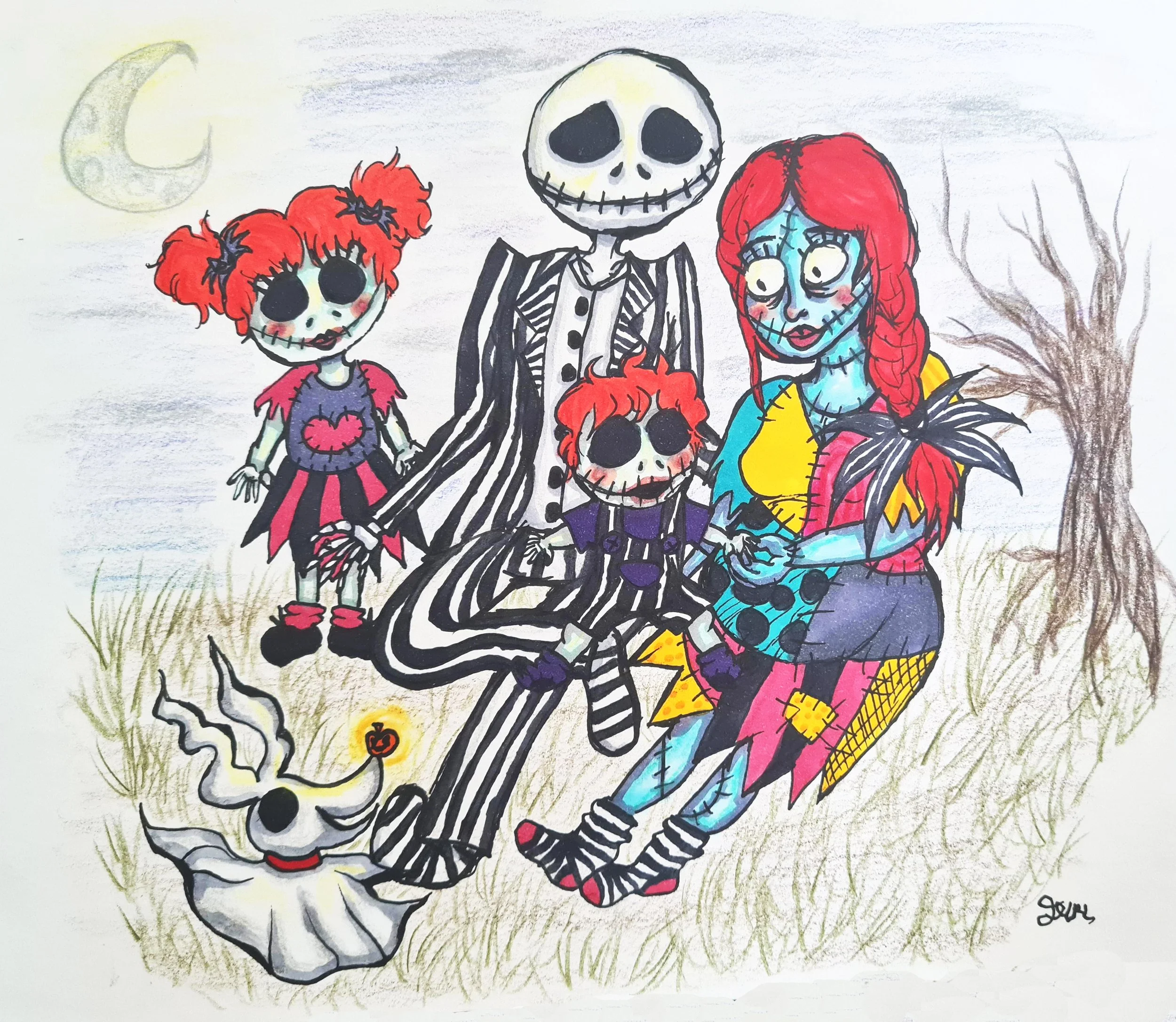 An illustration of Jack Skellington from Nightmare Before Christmas with his pregnant wife Sally, their two Skelly children and of course Zero enjoying a family moonlit picnic.