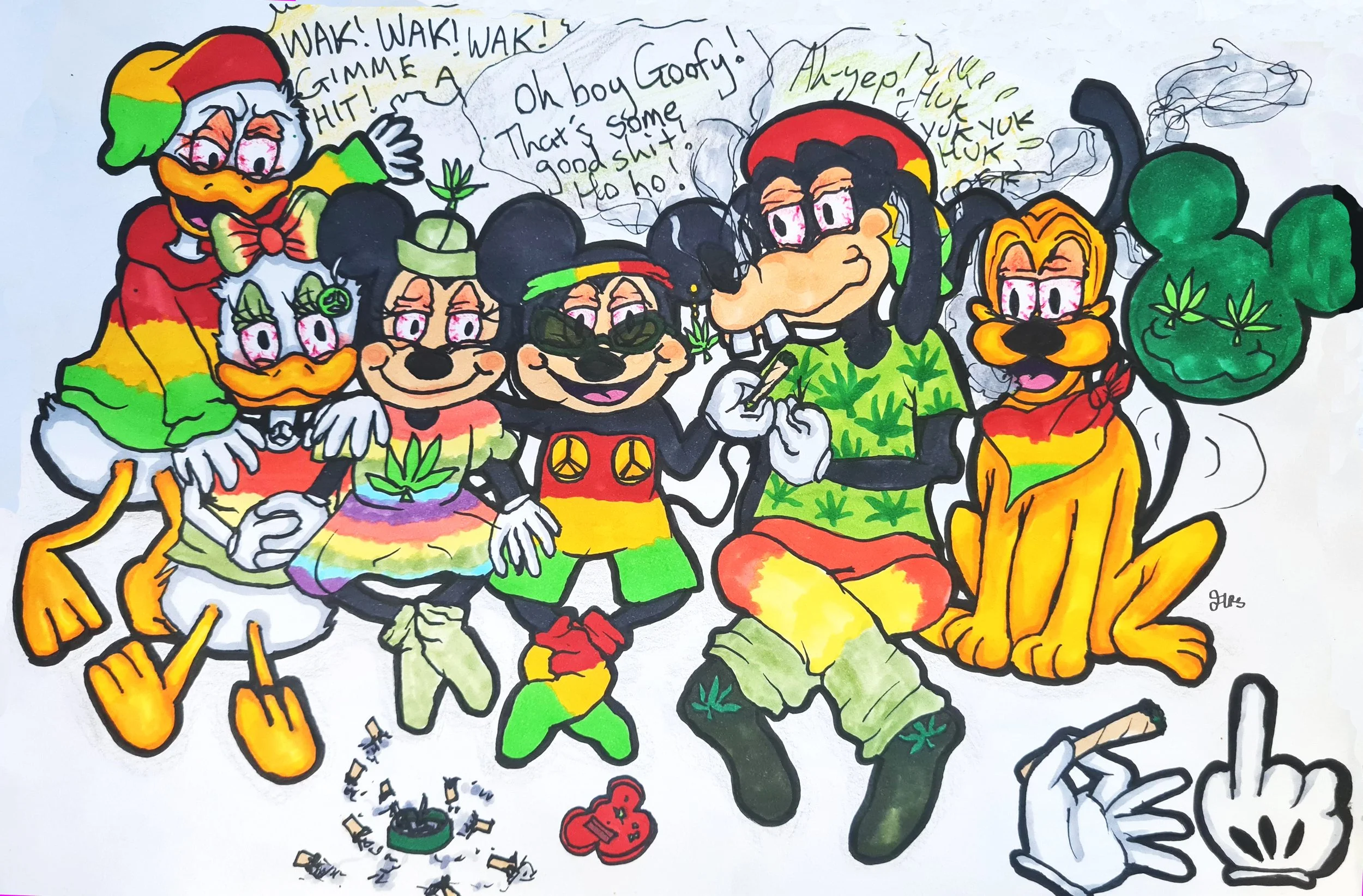 Mickey and his pals Pluto, Goofy, Minnie, Daisy & Donald (who of course has no chill in the passing circle) having a “bonding sesh” dripped out in 420 fab merch. Also featuring a green Mickey Mouse head and a spliff-smoking middle-finger-pulling pair of signature gloved Mickey hands.