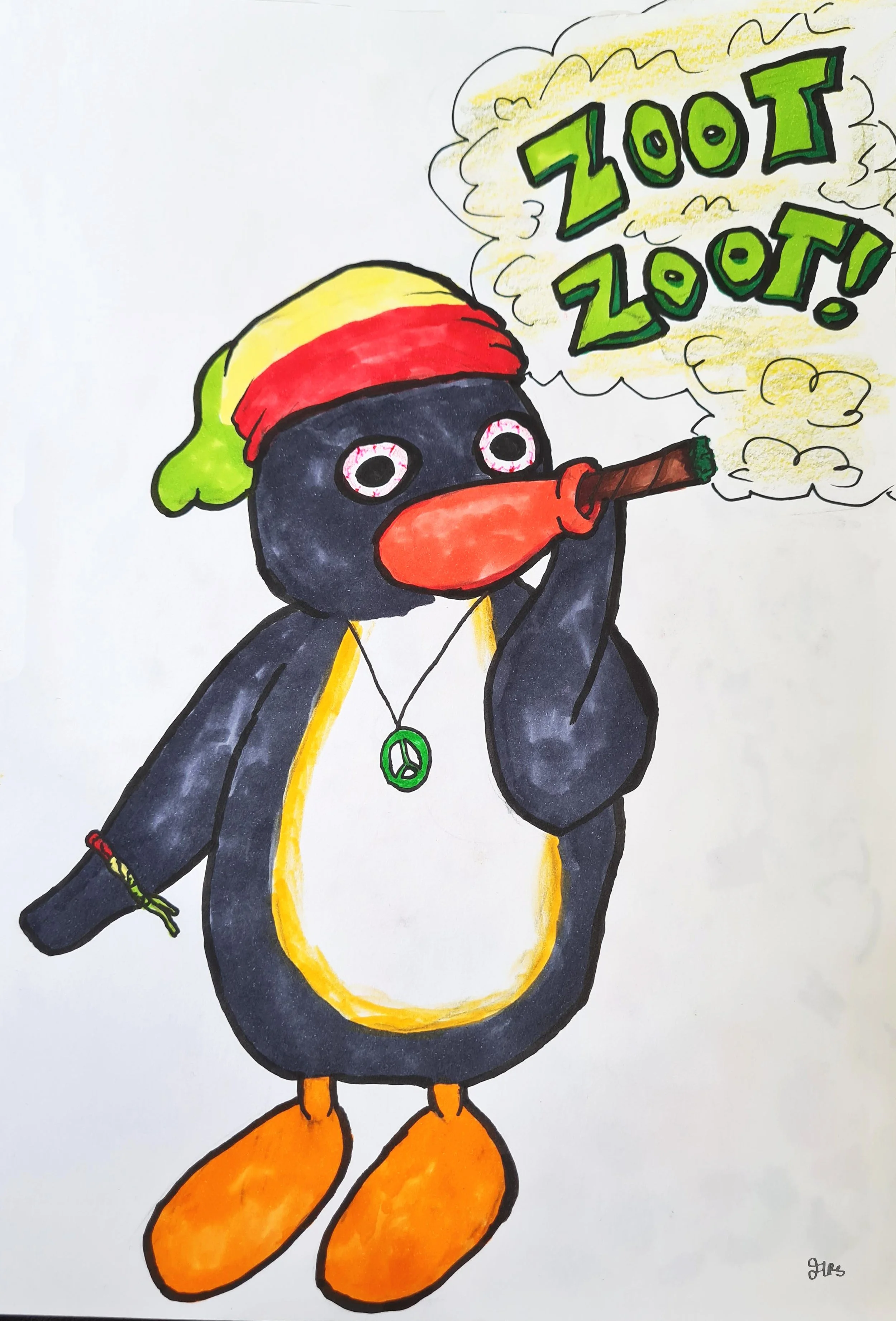 Unfortunately not even everyone’s beloved childhood mischievous penguin is safe… he grow up to find some Arctic Kush and no amount of spankings could keep him from his fat blunt. Zoot zoot!